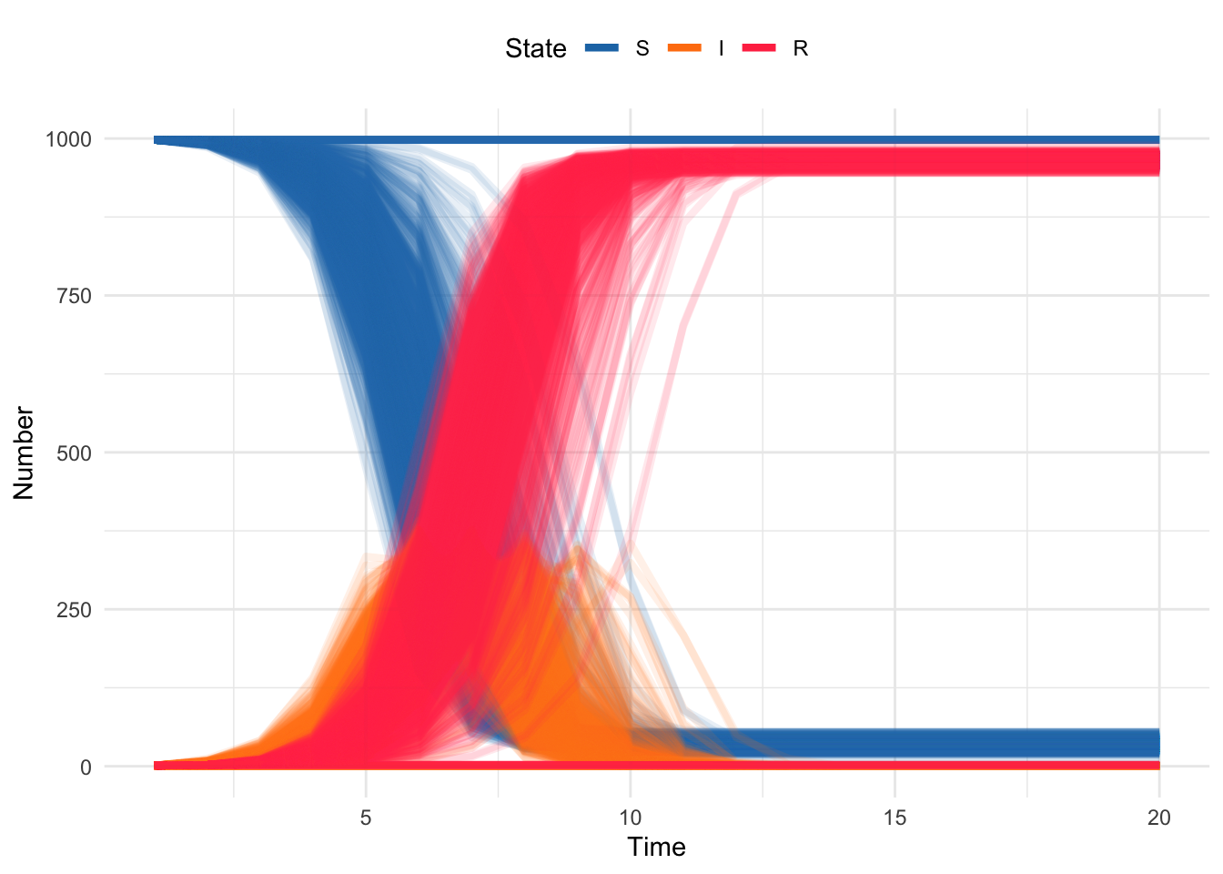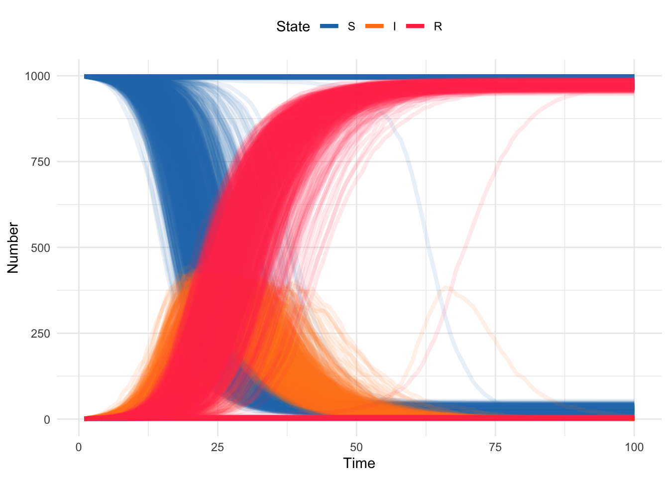 And plotting the simulated trajectories should look pretty close to what we got with Gillespie. But, because we can simulate many more iterations, we can start to observe some of the rarer behavior; e.g. even for simulations with \(R_0 = 3.5\) there are some simulation runs for which the epidemic doesn’t take off (S stays at 1000).
