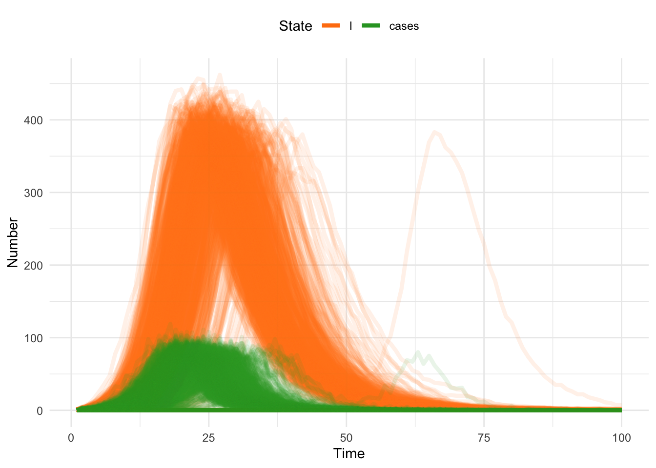 beta <- 3.5 # transmission rate -- note the change in valueWhen we implement the forward simulation, we now only have to generate random draws for the infection process, which again simplifies the amount of stochastic simulation we have to do, and speeds up run times. While this might not be limiting in the scale of this activity, this DOES become an issue when we have to fit stochastic models. Recall from the lecture on parameter estimation that the basic recipe has us build a model and test out all, or many, values of the parameters (here \(\beta\)) to find which one is closest to the data. Here, because each run of the stochastic simulation is different, we need to run simulations over many possible parameters, and for each parameter, we need to run many stochastic runs to characterize the average, or most likely, behavior. So, the number of simulations can rapidly increase into the millions (bigger for models with more parameters), so every bit of savings in computational time can be valuable.